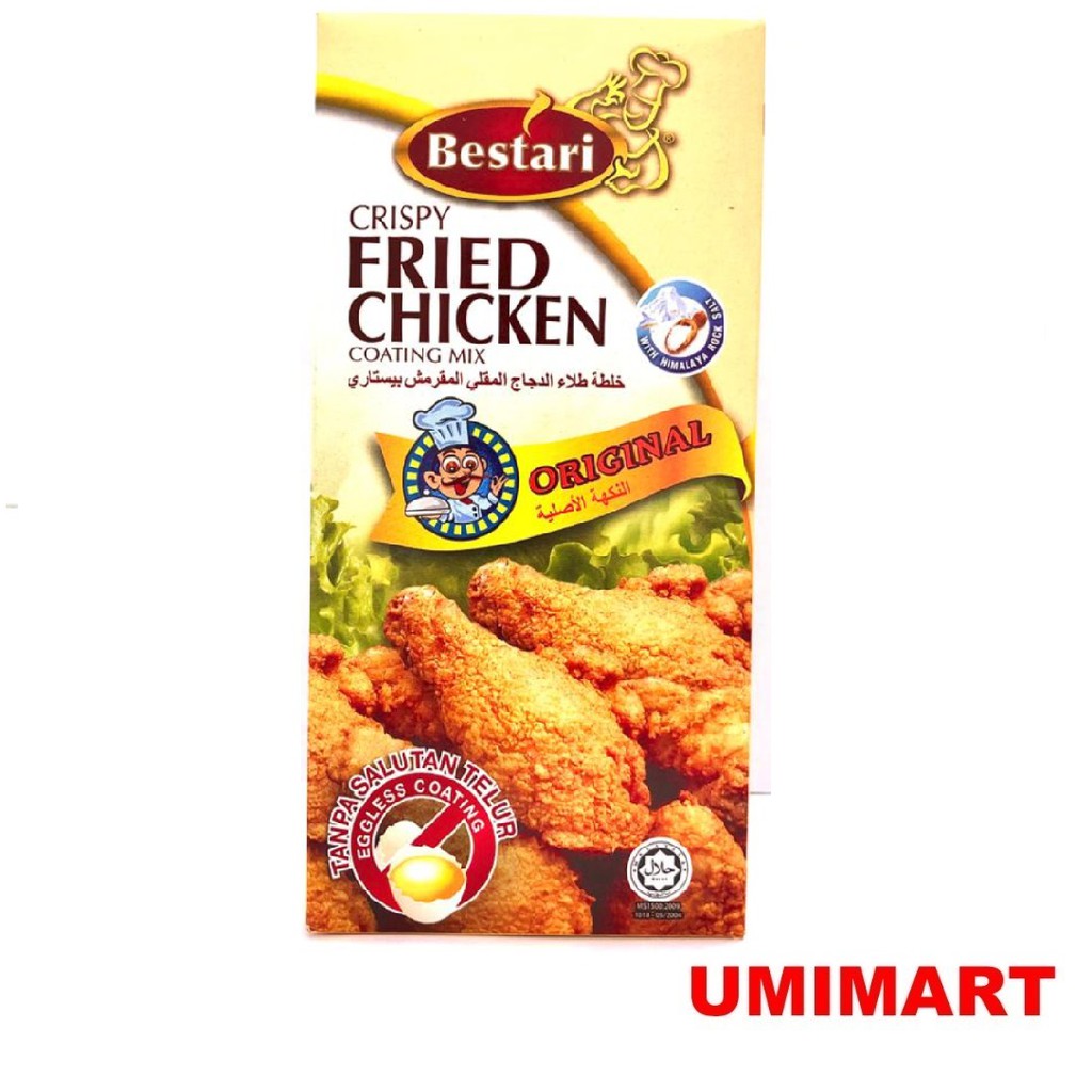 Ayam goreng tepung bestari kalori. Terdapat 190 kalori dalam ayam dilapisi tepung roti dan digoreng 4 buah. Jika risau tepung berterabur goncang ayam serbuk kering menggunakan bekas bertutup. Terdapat 260 kalori dalam ayam goreng 100 gram. Tepung bestari dicampur dengan serbuk cili satu sudu besar sedikit air dan secubit garam.