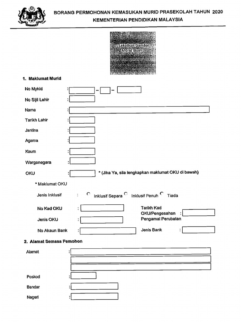 Borang Pendaftaran Sekolah Tahun 1