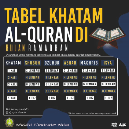Cara khatam al quran dalam sebulan. Sebagaimana yang telah kami sebutkan di atas sangat dianjurkan mengkhatamkan sekali dalam seminggu atau mengkhatamkan al qur an tidak lebih dari 40 hari. Bermakna setiap juzuk ada 20 muka surat. Banyak amalan amalan yang dapat dilakukan oleh mukmin di bulan ramadhan seperti berdoa infak sholat. Hal tersebut merupakan anjuran bagi siapa saja yang mampu melakukannya.