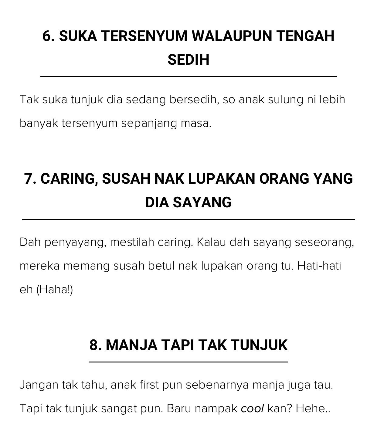 Aku anak bongsu tapi sejak dari kecil sume benda buat sendiri mcm basuh baju mkn minum mak aku dah tua sgt ayah aku meninggal aku kecil lg. Kadang kadang happy tapi sekejap lagi korang boleh tengok dia tiba tiba muram pulak. So untuk korang yang nak mengakhiri zaman bujang dengan si anak bongsu ni apa kata hadamkan dulu antara sikap sikap comel mereka ni. Tetapi sikap terpuji anak sulung adalah mudah bertolak ansur dan tidak bergaduh untuk berebutkan sesuatu.