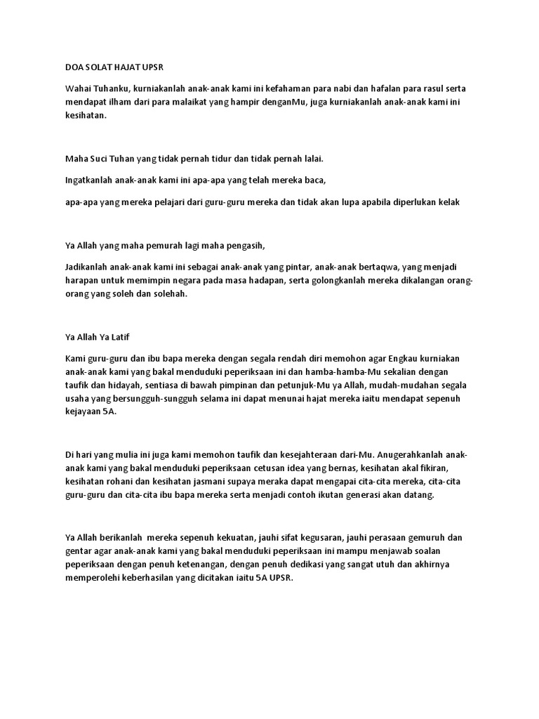 Solat sunat dan doa hajat solat sunat yang didirikan untuk memohon hajat atau ketika berada dalam permasalahan dan kesukaran ia dilakukan bagi mengharapkan pertolongan daripada allah swt dan memohon sesuatu perkara atau menolak sesuatu yang tidak diingini agar apa yang dihajati itu dikabulkan walau bagaimana pun ia hendaklah disertai dengan keazaman dan usaha yang gigih di samping bertawakal. You are on page 1 of 2. Cari di dalam dokumen. Doa solat hajat untuk peperiksaan insha allah minggu depan dah bermula peperiksaan penting bagi pelajar tingkatan 3 dan dua minggu selepas itu di ikuti dengan peperiksaan spm fasa pertama.