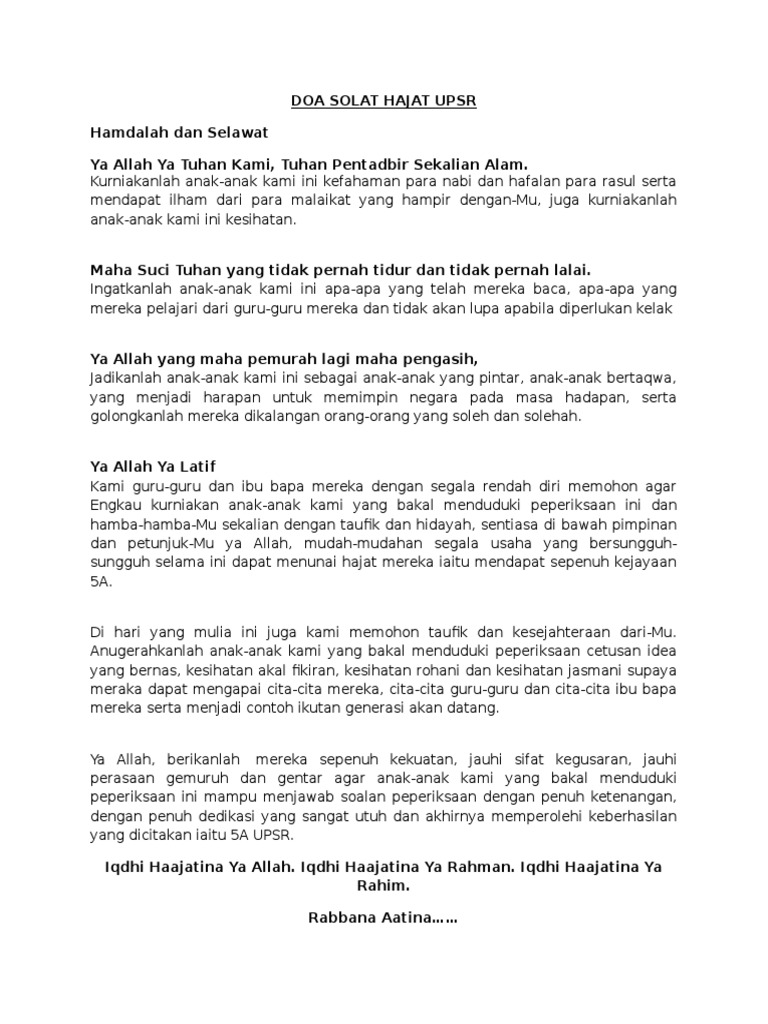 Sempena menghadapi peperiksaan 03. Doa peperiksaan solat hajat. Lompat ke halaman. Ya allah ya tuhan kami ampunilah dosa kami dosa kedua ibu bapa kami dosa guru guru kami dosa anak anakkami dosa anak didik kami dan dosa seluruh muslimin muslimat samada yang masihhidup atau yang telah mati ya allah ya tuhan kami kami menadah tangan kepadamu berkatilah segala ilmu yang telah kami pelajari berkatilah segala ilmu yang telah kami ajarkan kepada anak didik kami keluarkanlahkami daripada lembah kejahilan dan kegelapan kepada daerah cahayamu.