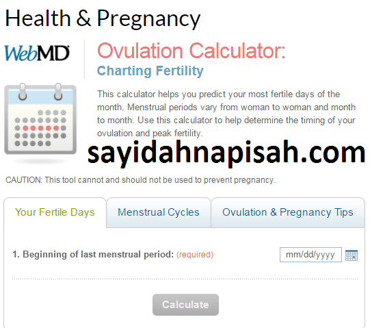 Boleh cuba kalkulator percuma dari webmd dan womenshealth. Kalkulator untuk menghitung masa subur wanita dengan sistem kalender. Ada yang lambat datang haid ada yang awal ada yang tidak teratur waktu haid nya. Kira waktu kitaran haid dan kira waktu subur wanita yang sebenar dan tepat.