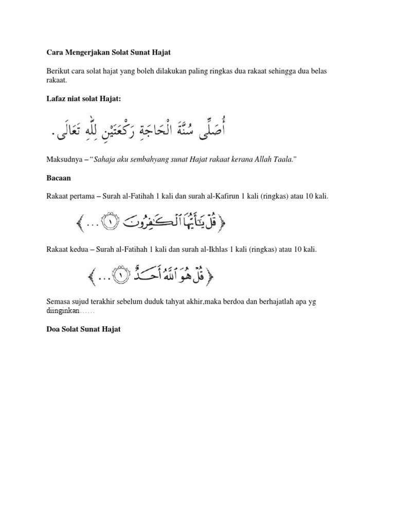 Lafaz niat solat hajat. Solat sunat dan doa hajat solat sunat yang didirikan untuk memohon hajat atau ketika berada dalam permasalahan dan kesukaran ia dilakukan bagi mengharapkan pertolongan daripada allah swt dan memohon sesuatu perkara atau menolak sesuatu yang tidak diingini agar apa yang dihajati itu dikabulkan walau bagaimana pun ia hendaklah disertai dengan keazaman dan usaha yang gigih di samping bertawakal. Aku niat shalat sunnah istikharah 2 rakaat karena allah 7. Lafaz niat solat sunat hajat ialah.