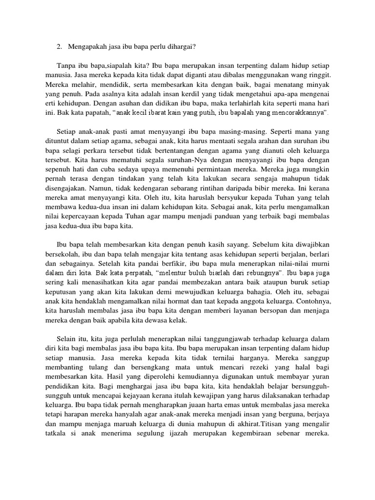 Seoang anak yang tahu mengenang jasa bagaimana pasti akan menjaga orang tua mereka secara ikhlas. Sekarang tugas anak anak membalas jasa ibu bapa. Seseorang anak mestilah sentiasa hormat taat akan suruhan menunjukkan kemesraan ringan tulang dan mestilah menjaga maruah dan nama baik keluarga. Contoh penulisan esei tak berformat 2015 soalan esei tidak berformat.